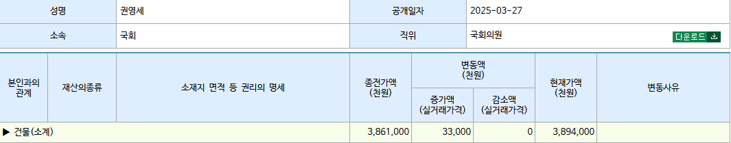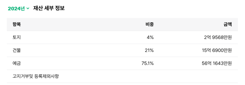 ※ 상세내역은 2025년 3월 27일 국회공보 제2025-51호(재산공개) 를 통해 발표된 국회의원 정기 재산 신고내역 파일 참고 부탁드립니다.