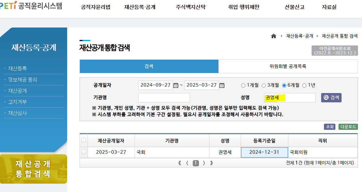 ▶ 공직윤리시스템 > 재산등록 공개> 재산 공개 통합검색 : 검색 기능으로 의원별 세부 내역 조회.