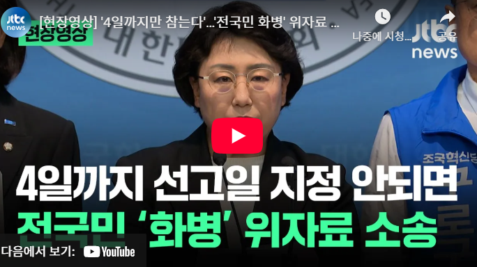 조국혁신당은 윤석열 대통령 탄핵 심판과 관련해 헌법재판소의 선고 지연을 문제 삼아, 이로 인해 국민들이 겪고 있는 정신적 고통, 즉 ‘화병’을 이유로 위자료 청구 소송을 추진하겠다고 발표했습니다. 화병은 한국에서 흔히 사용되는 용어로, 억울함이나 분노가 쌓여 정신적·신체적 증상을 유발하는 상태를 뜻합니다. 당은 헌재가 2025년 4월 4일까지 탄핵 심판 선고 기일을 지정하지 않을 경우, 책임이 가장 크다고 판단되는 헌법재판관 한 명을 특정해 소송을 제기할 계획이라고 밝혔습니다.