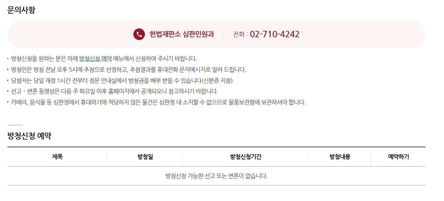 윤석열 탄핵 심판의 경우 일반인 방청 신청이 가능한 것으로 보도되고 있으므로, 헌재 공지가 나오면 헌법재판소 홈페이지 > 선고.변론> 방청신청> 예약하기에서 진행해 주시면 됩니다.