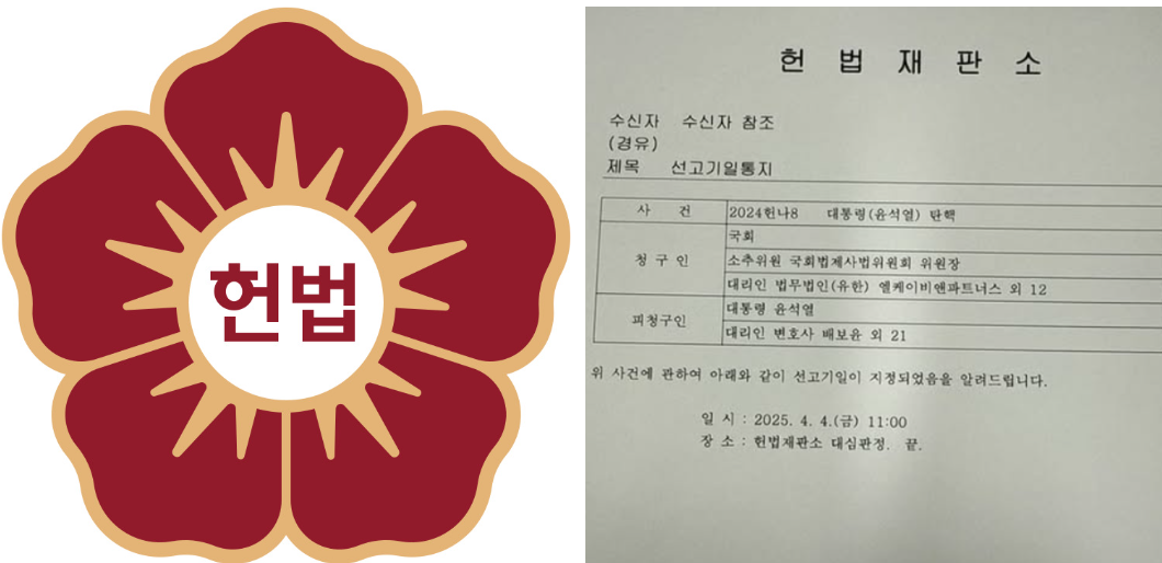 민주당 법사위원장과 국회의장실은 헌법재판소로부터 윤석열 대통령 탄핵 선고일을 4월 4일 (금) 11시로 통지받았다고 합니다. 정청래 의원은 통지를 받은 이후 페이스북에 받은 공문과 함께 글을 게시하였습니다. 윤석열 탄핵 심판은 생중계도 하고 일반인 방청도 가능하다고 합니다.