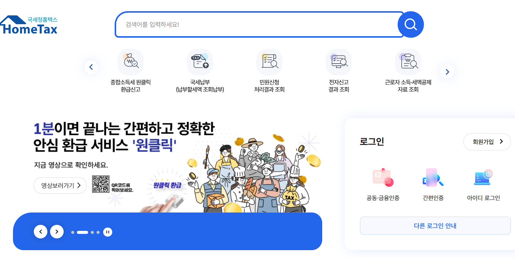 홈택스 첫 화면에 들어가면 ‘원클릭 환급 신고’ 버튼을 클릭하면 환급 신청 절차로 바로 이동합니다.