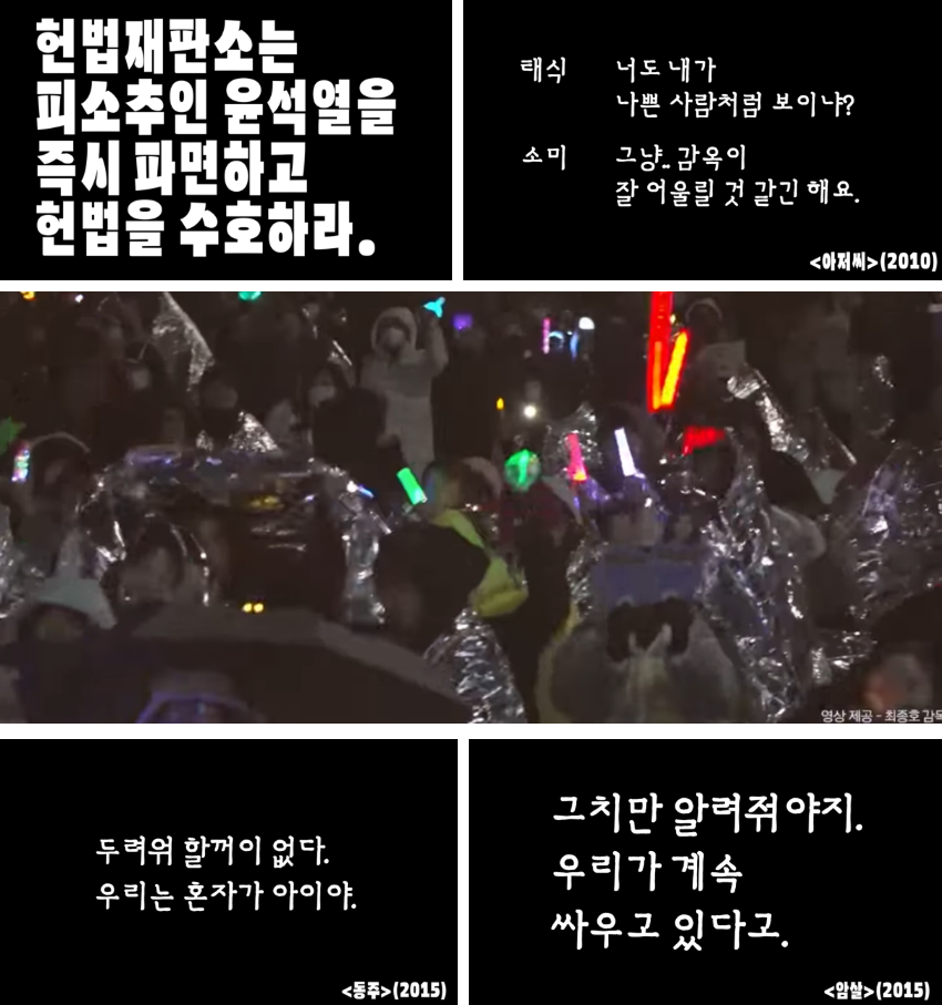 이 성명서는 단순한 정치적 발언이 아니라, 영화라는 예술을 통해 사회적 메시지를 전달해온 영화인의 책임감이 담긴 행동으로 해석되며 영화 명대사와 12월3일 비상계엄날의 모습, 헌법 수호를 위해 나선 시민들의 모습등으로 만들어진 1분 52초의 짧은 영상이지만 많은 이들에게 깊은 울림을 주고 있습니다.