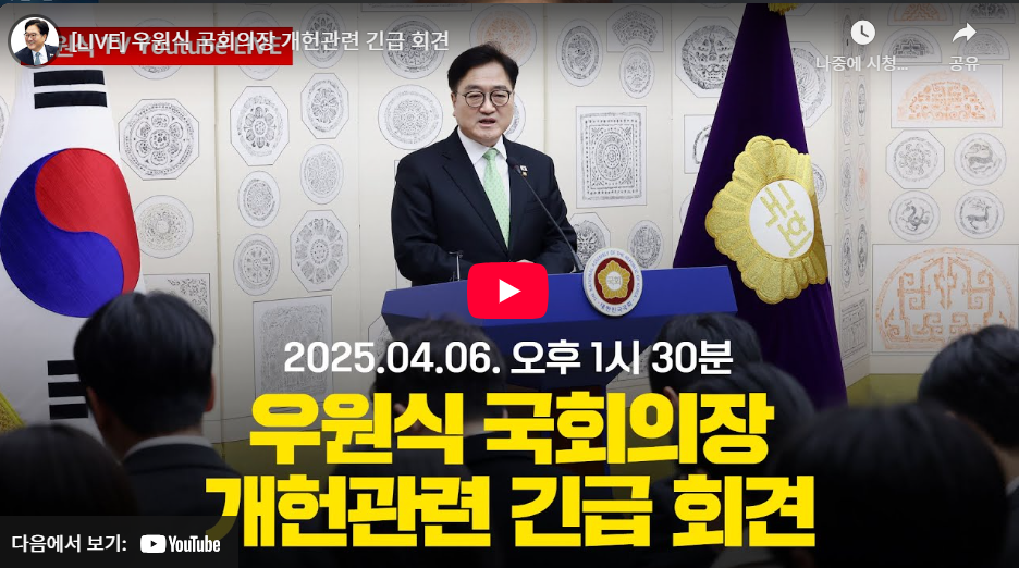 우원식 국회의장은 4월 6일 긴급 기자회견을 통해 개헌의 시급성을 강조합니다. 그는 "낡은 헌법의 한계가 국민 삶의 질 향상을 제약하고 있습니다"라며, 특히 제왕적 대통령제와 승자독식 정치 구조를 개혁해야 한다고 역설합니다. 주요 제안 내용은 다음과 같습니다: