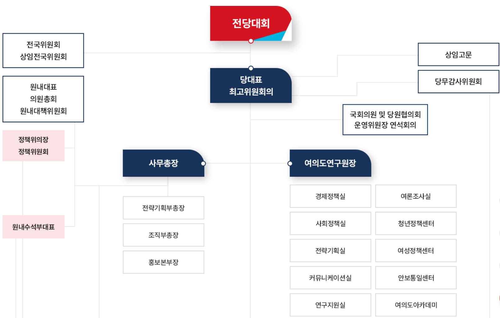 국민의힘은 당의 운영을 책임지는 핵심 인물들과 다양한 조직으로 구성되어 있습니다.