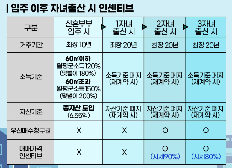 - 전용면적 60㎡ 초과: 도시근로자 월평균 소득 150%(맞벌이 200%) 이하, 자산 6억 5,500만 원 이하