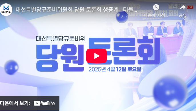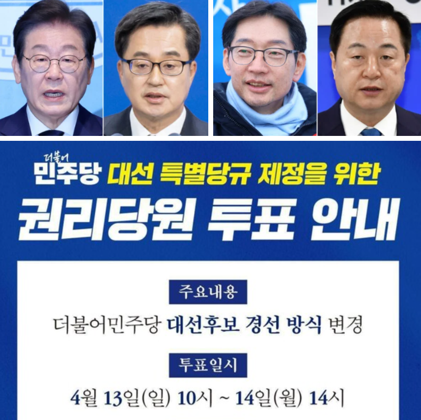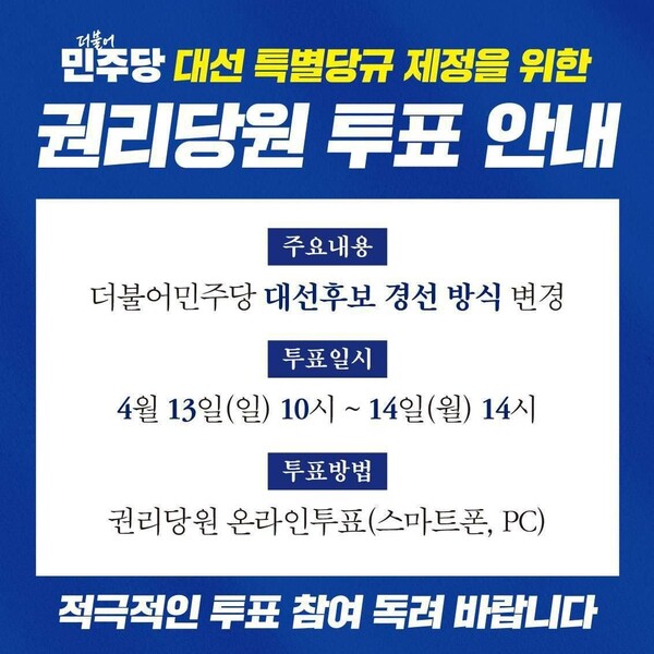 더불어민주당은 대선 후보 경선 방식 변경을 위해 권리당원 투표를 실시합니다. 이번 투표는 기존에 잠정 확정된 ‘권리당원 50%, 일반 국민 여론조사 50%’의 국민참여경선 방식을 최종 승인하거나 수정하는 과정입니다.