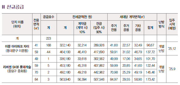 - 이문 아이파크자이(동대문구 이문동): 전용면적 41㎡(168세대, 3억 2,214만 원), 59㎡(44세대, 4억 6,410만 원). 외대앞역과 신이문역 사이 초역세권으로, 중랑천과 천장산이 인근에 있어 쾌적한 주거 환경을 자랑합니다.