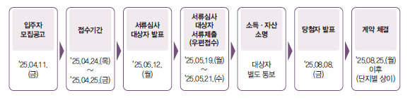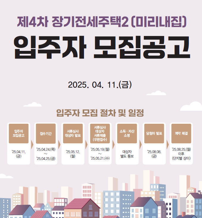 서울시는 4월 24일부터 25일까지 제4차 미리내집(장기전세주택Ⅱ) 367세대 입주자 모집을 진행합니다. 모집절차 및 일정은 아래와 같습니다.