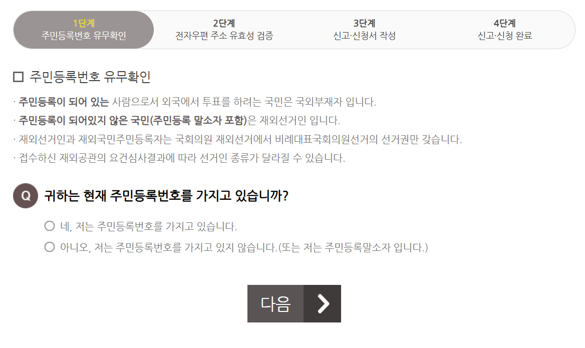 첫째, 재외선거인은 영구적으로 해외에서 투표를 원하는 분들을 위한 등록 제도입니다. (주민등록이 되어 있지 않은 국민(주민등록 말소자 포함) [가족관계등록부(옛 호적부)에만 등재된 사람)