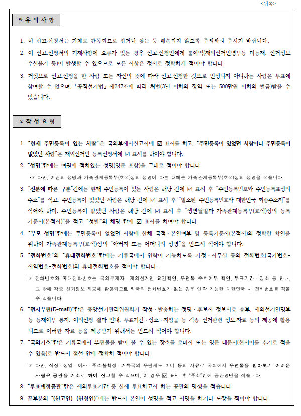 둘째, 국외부재자는 일시적으로 해외에 체류 중이지만 선거 기간 동안 투표를 원하는 분들을 위한 신고 제도입니다. (주민등록이 되어 있는 사람으로서 외국에서 투표를 하려는 국민)