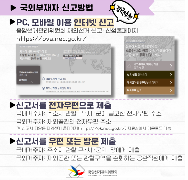 - 온라인 신청 활용: 대사관 방문이 어려운 경우, 중앙선거관리위원회 홈페이지에서 간편하게 신청할 수 있습니다.