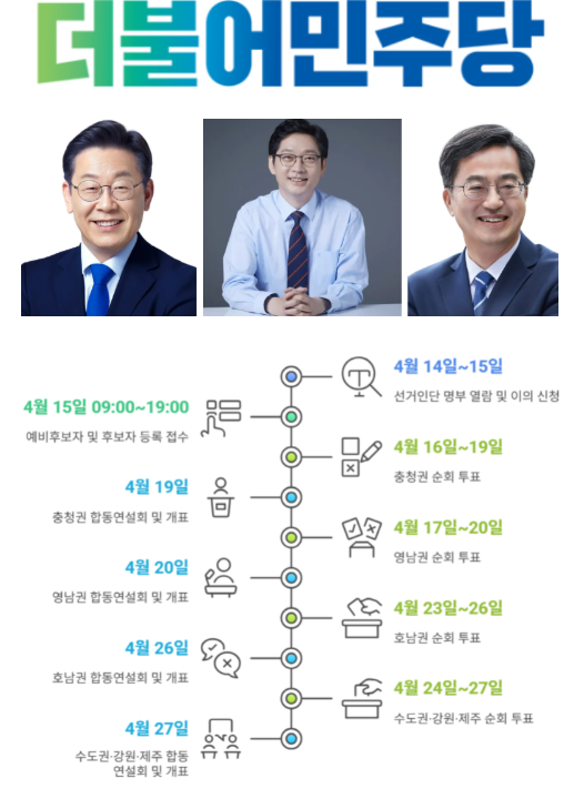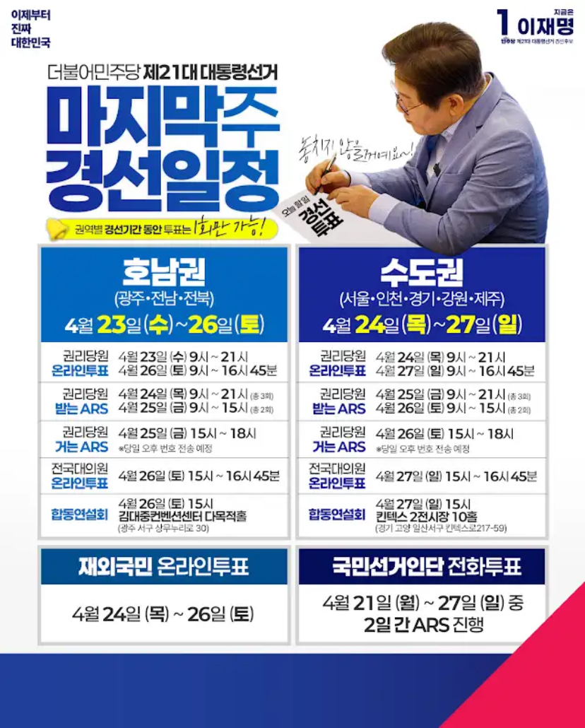 - 4월 21일~27일: 기간주 이틀에 걸쳐 국민선거인단 투표 ( 권리당원 투표 50% + 일반 국민 여론조사 50%)