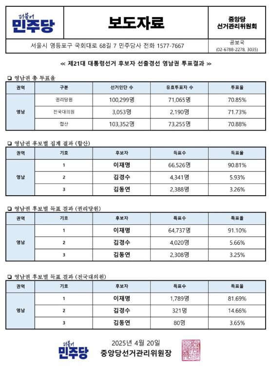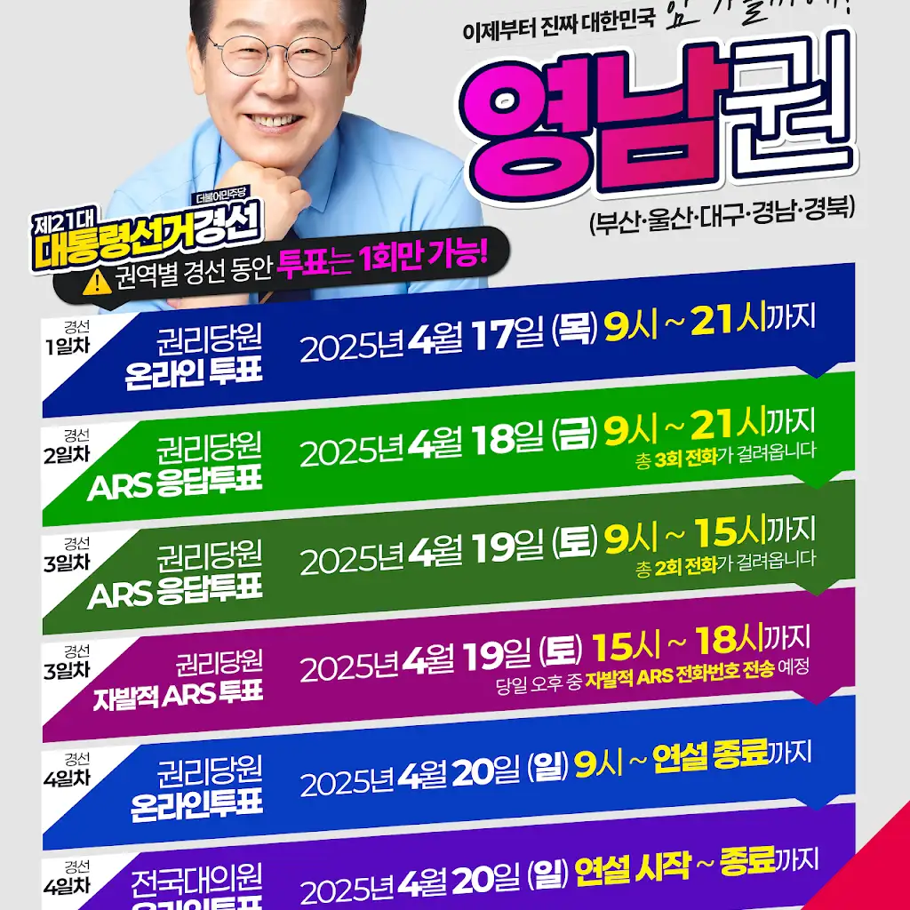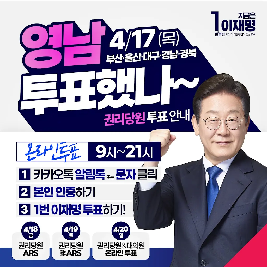 목차 2025년 4월 20일, 더불어민주당은 울산전시컨벤션센터에서 제21대 대통령 선거 후보를 선출하기 위한 영남권 합동연설회를 진행 중입니다. 영남권(대구·경북, 부산·울산·경남)은 민주당의