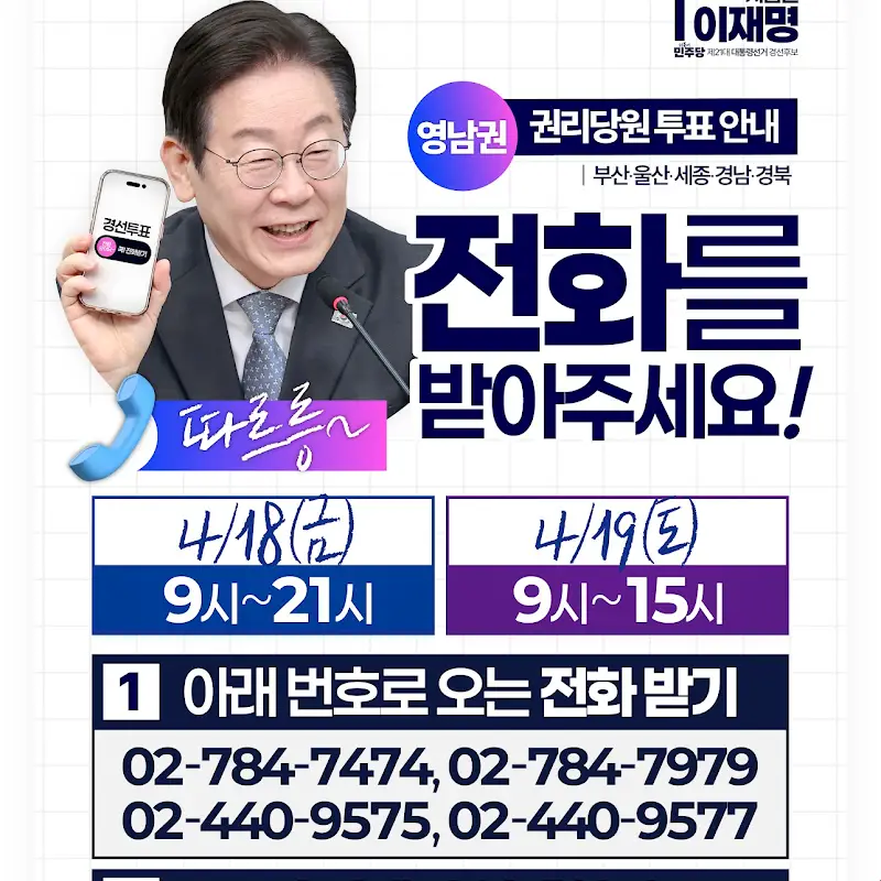 - 영남권(부산·울산·대구·경남·경북) 순회 투표 : 4월 17일~20일 ( ARS번호 : 02-784-7474, 02-784-7979, 02-440-9575, 02-440-9577 )