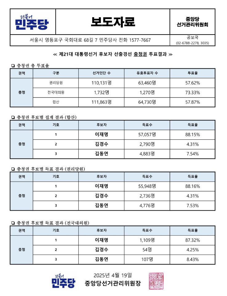 2025년 충청경선 결과 및 이재명 당선 소감