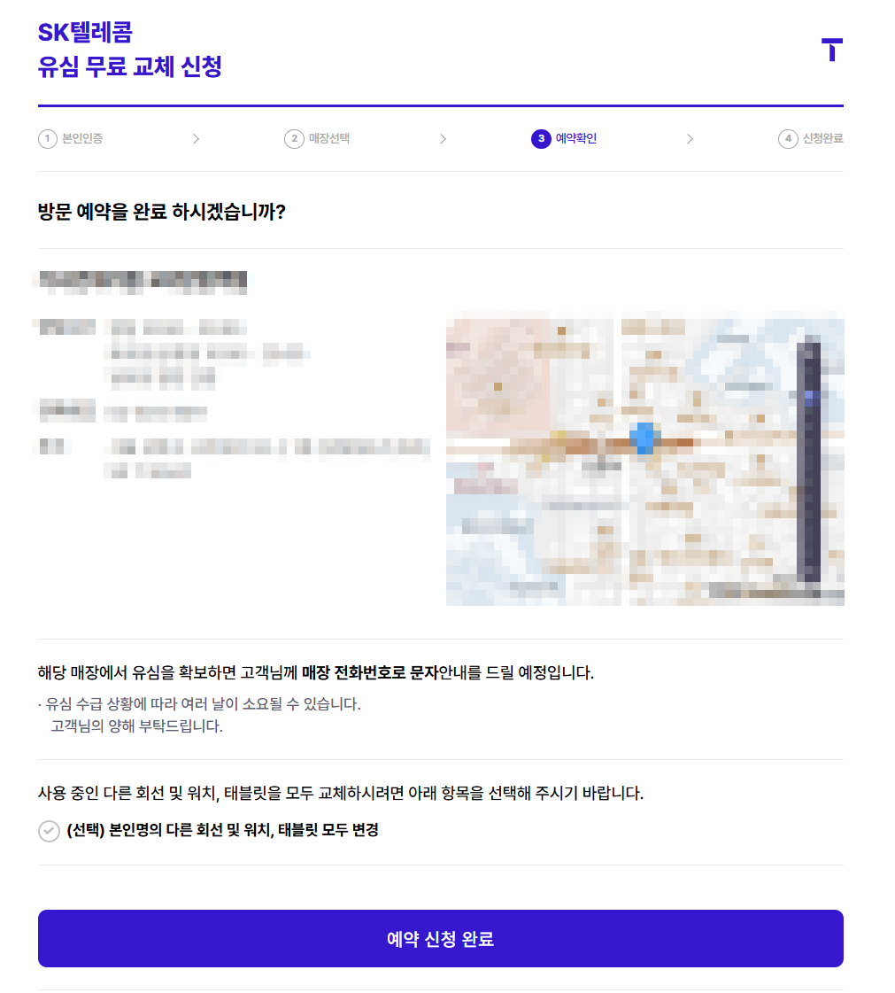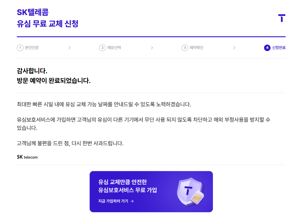 T월드 홈페이지에서 유심 교체를 위해 예약을 신청할 수 있습니다. 아래와 같이 1/2/3/4 단계에 따라 정보를 기입하신 후 신청완료 하시면 현재 재고 부족으로 해당 매장에서 재고 확보시 문자 안내를 하겠다는 신청 완료 메시지가 나옵니다