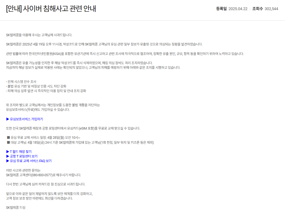 ▶ 정보 유출 관련 SKT 최근 공지 및 조치 확인하기
