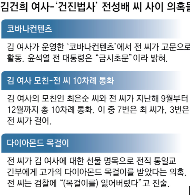 건진법사 논란은 통일교와의 연루 의혹으로 더욱 복잡해졌습니다. 2022년, 통일교 전 세계본부장 윤 모 씨는 전성배 씨에게 6000만 원 상당의 다이아몬드 목걸이를 건넸으며, 이는 "김건희 여사에게 전달해 달라"는 명목이었다고 주장했습니다. 그러나 전 씨는 "목걸이를 잃어버렸다"고 밝히며 김 여사에게 전달되지 않았다고 주장했습니다. 검찰은 이 사건을 통해 전 씨가 통일교와 윤석열 부부 간의 만남을 주선하며 금품을 수수했을 가능성을 조사 중입니다.