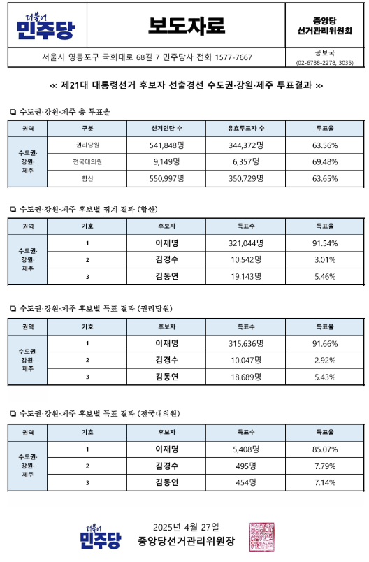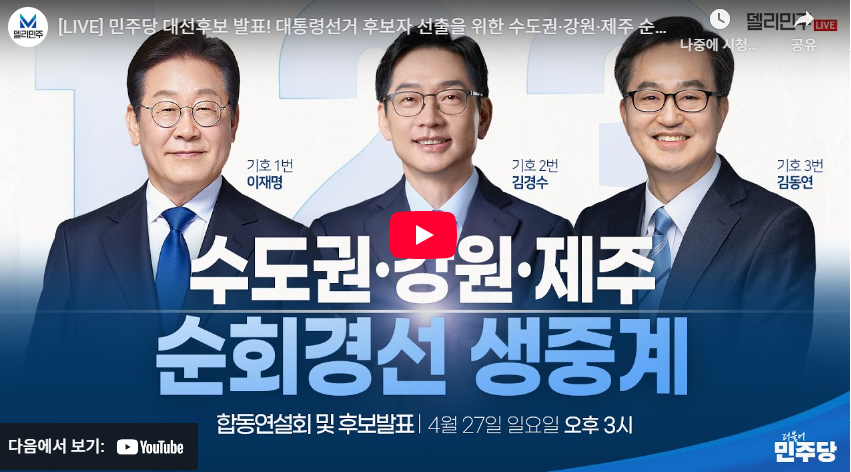 더불어민주당은 제21대 대통령 선거 후보를 선출하기 위해 4월 16일부터 27일까지 충청, 영남, 호남, 수도권·강원·제주 등 4개 권역에서 순회 경선을 진행했습니다. 경선 방식은 기존의 완전국민경선제를 폐지하고, 당원 주권 강화와 역선택 방지를 위해 권리당원 투표와 국민 여론조사를 각각 50%씩 반영하는 새로운 규칙을 채택했습니다.