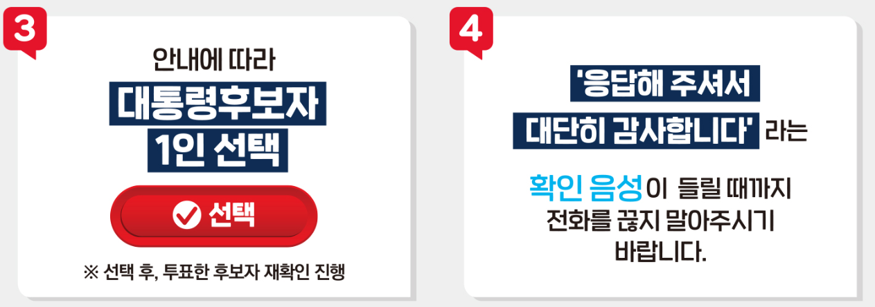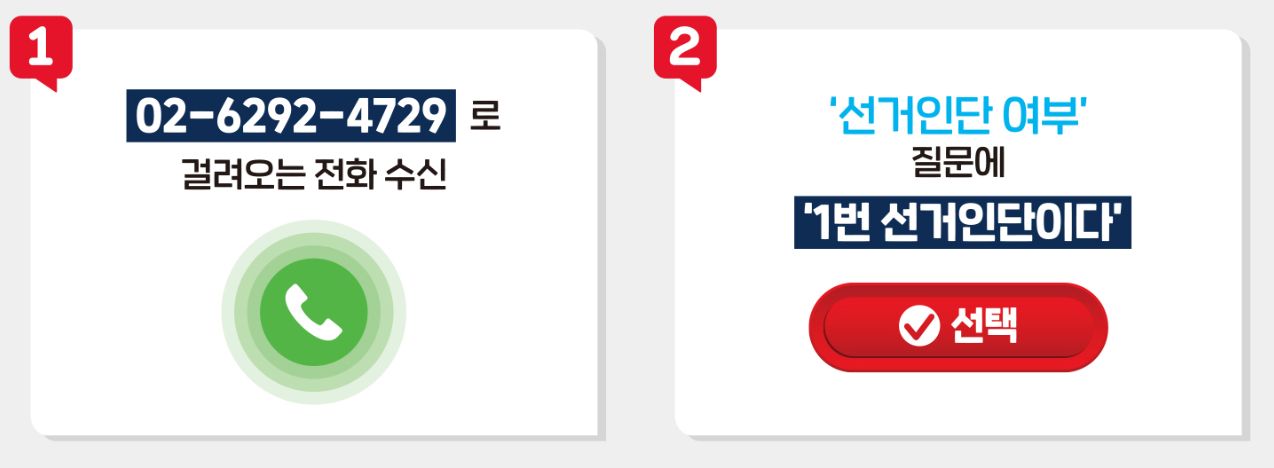 - 방법: 걸려오는 전화를 수신 (발신 번호 02-6292-4729) 후 전화하여 음성 안내에 따라 후보를 선택합니다.
