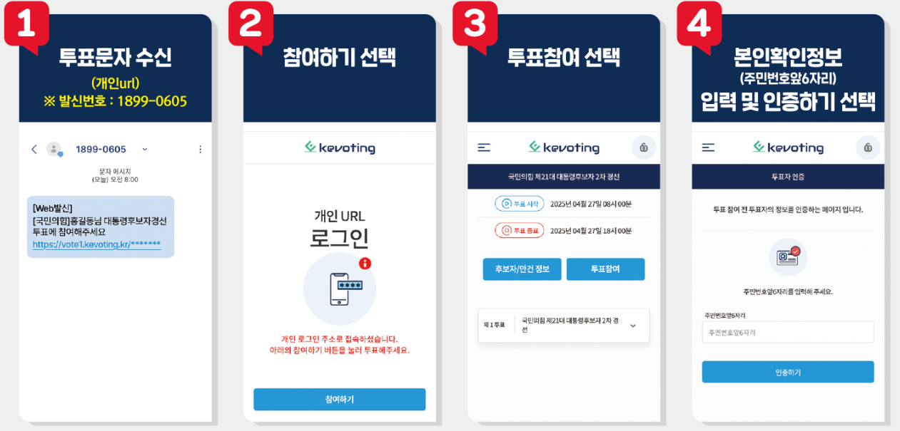 - 투표 알림 문자 확인: 국민의힘에서 발송한 문자 메시지(발신번호: 1899-0605 )를 확인합니다. 문자에는 투표 참여를 위한 URL 링크가 포함되어 있습니다.