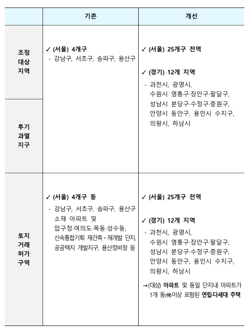대책의 포문은 토허구역 대폭 확대입니다. 10월 16일부터 서울 25개 전 자치구와 경기 12개 지역(과천·광명·성남 분당·수정·중원구·수원 영통·장안·팔달구·안양 동안구·용인 수지구·의왕·하남)을 조정대상지역 및 투기과열지구로 지정합니다. 여기에 10월 20일부터 내년 12월 31일까지 토허구역으로 추가 지정하며, 필요 시 연장을 검토합니다. 대상은 아파트와 단지 내 연립·다세대 주택으로, 기존 강남 4구 중심에서 서울 전역으로 확대되었습니다.