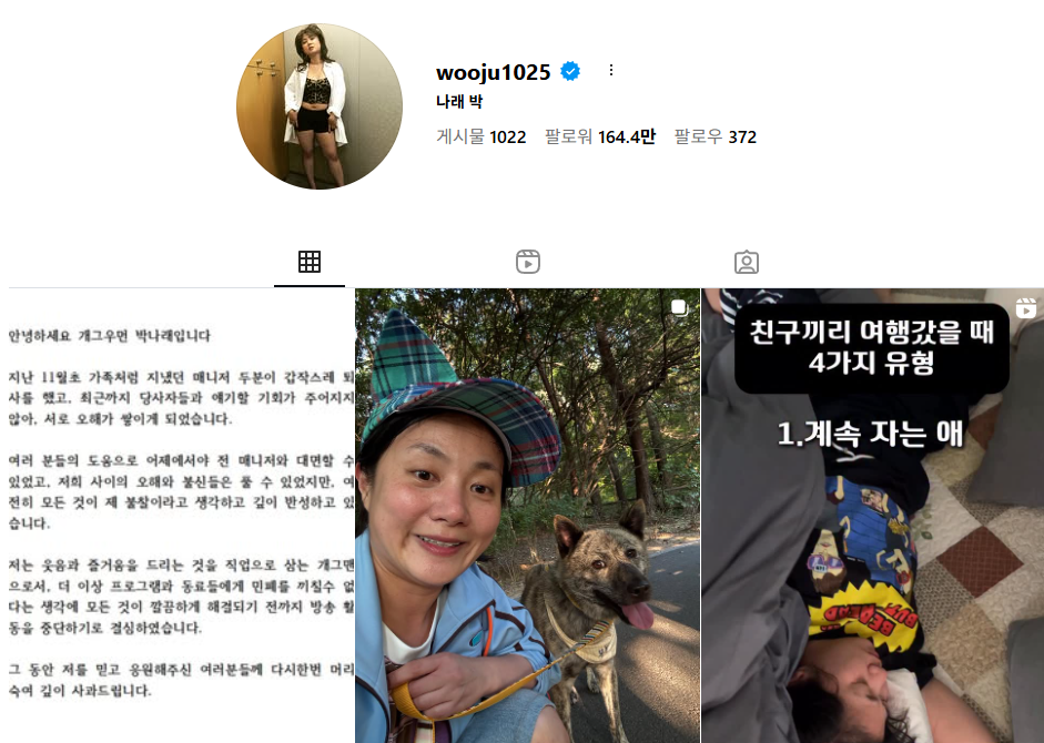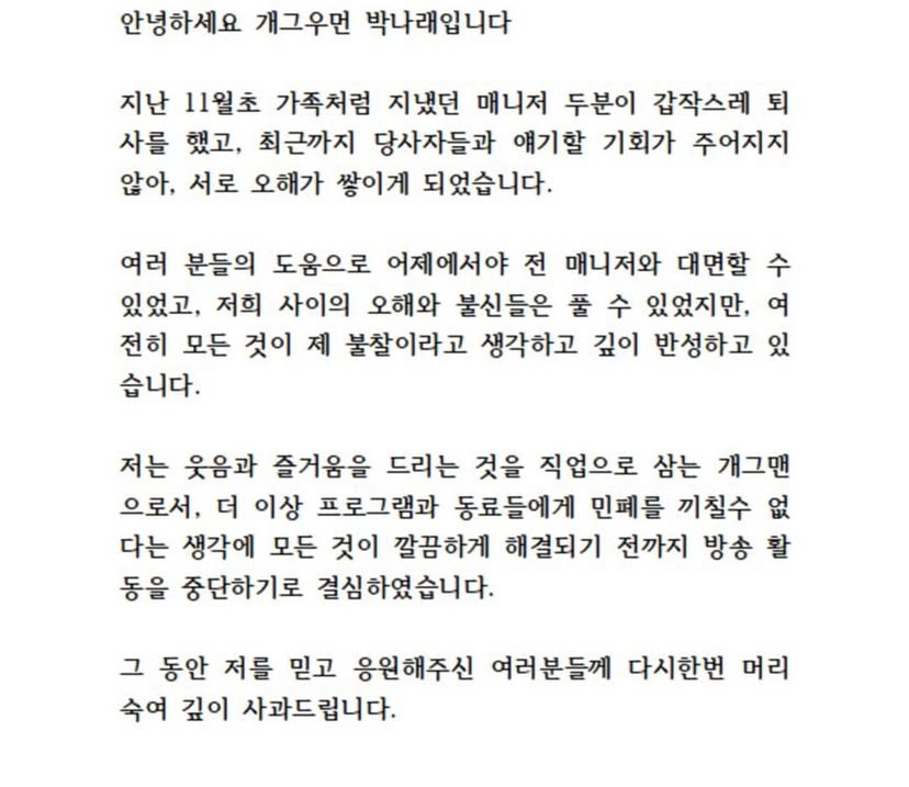 박나래 활동중단 인스타 게시물
