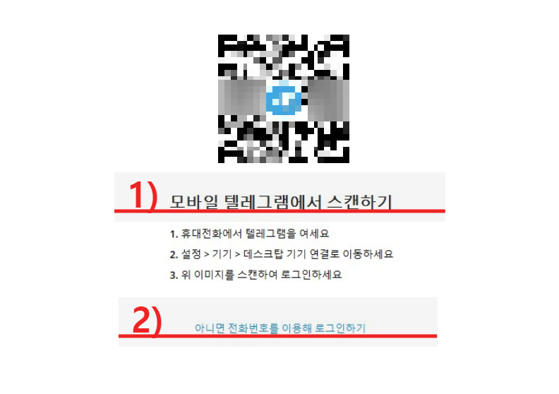 설치된 텔레그램을 실행시키시면 최초 실행시 로그인이 필요합니다. 핸드폰에서 기존에 텔레그램을 사용하고 계신 경우 1) 휴대폰에서 QR코드스캔하시거나 휴대폰에 설치된 텔레그램에서 기기연결을 통해 로그인 가능하시고 신규가입이신 경우 2) 전화번호를 이용해 로그인하기를 선택하시면 됩니다.