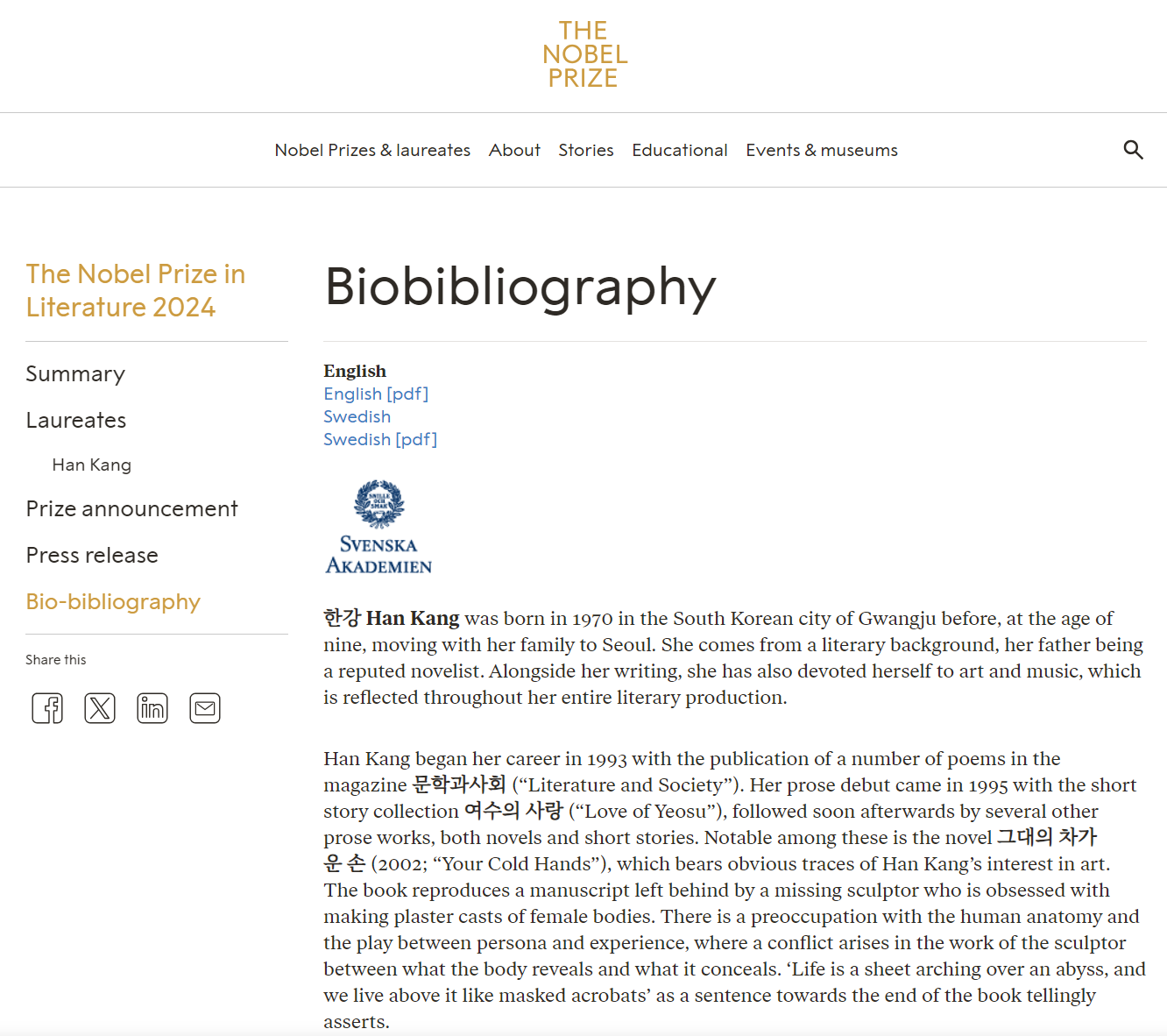 노벨위원회에서 발표한 한강 Biobibliography (전기)