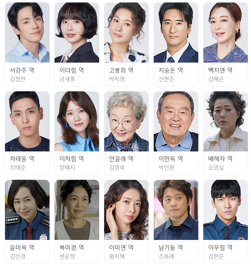 서강주 역 김정현, 이다림 역 금새록, 고봉희 역 박지영, 지승돈 역 신현준, 백지연 역 김혜은, 차태웅 역 최태준, 이차림 역 양혜지, 안길례 역 김영옥, 이만득 역 박인환, 배해자 역 오영실, 윤미옥 역 김선경, 복미경 역 변윤정, 이미연 역 왕지혜, 남기둥 역 조복래, 이무림 역 김현준, 송수지 역 하서윤, 김성훈 역 박성현, 최형철 역 이성열, 유팀장 역 유일한, 김DD 역 주새벽, 철순 역 이왕수, 상순 역 승형배, 오민기 역 강덕중, 남봄 역 정서연, 최신 역 한수호, 양길순 역 이규호