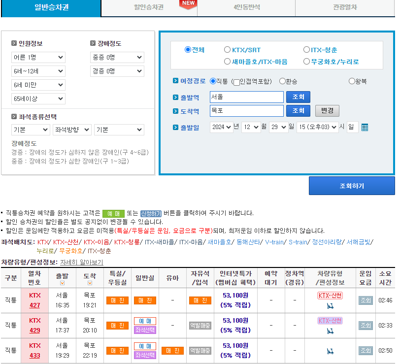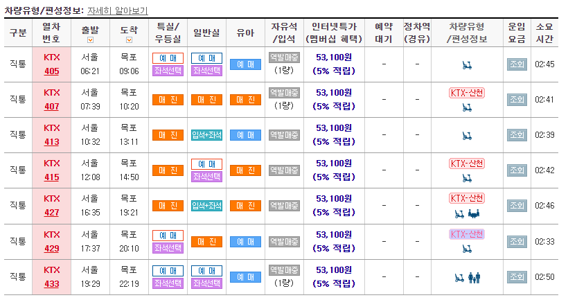 ▶ KTX 임시열차 시간표 (하행 서울 → 목포)