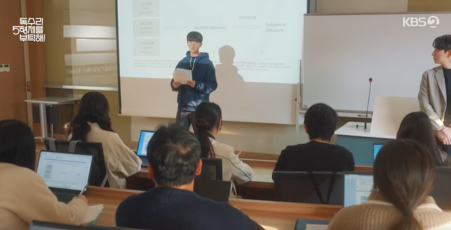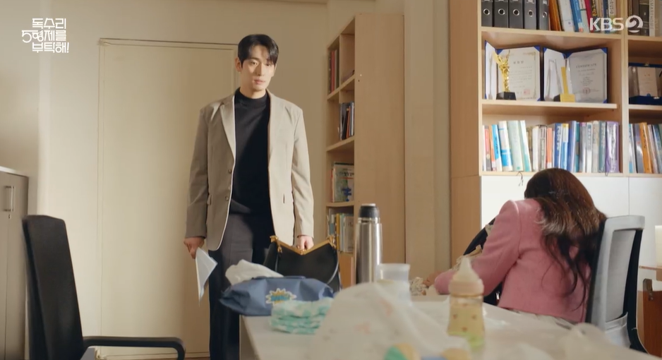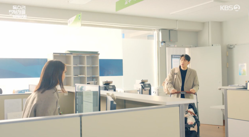 사무실 조교에게 아이를 잠깐 봐달라고 부탁을 하는데 조교는 마침 일이있어 아이를 볼수 없게 됩니다. 결국 아이를 데리고 가서 학생들에게 양해를 구하고 강의를 하겠다는 범수에게 조교는 여기는 미국이 아니라며 만류를 합니다.