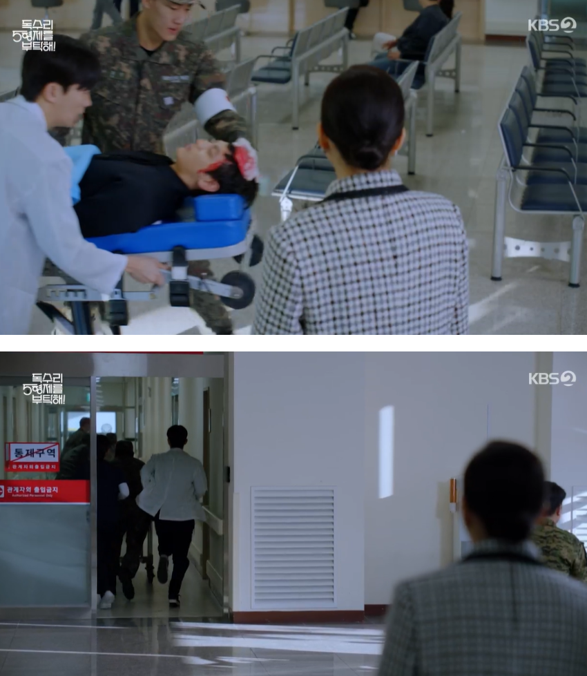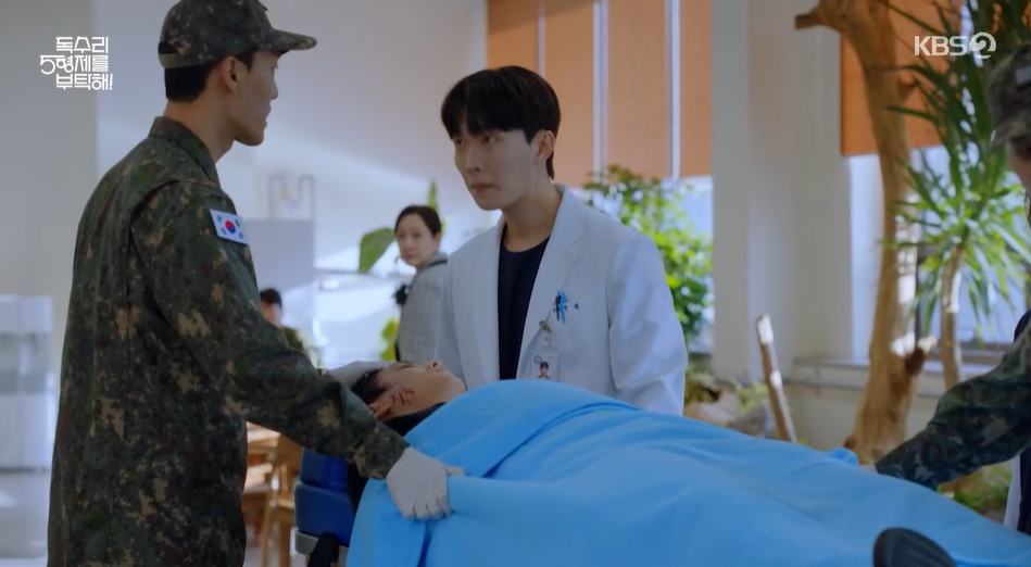 마침 응급환자 소식을 듣고 자리에서 일어나는 결이. 알고보니 마침 막내 강수가 훈련중 사고로 의식을 잃고 실려온 상황입니다.