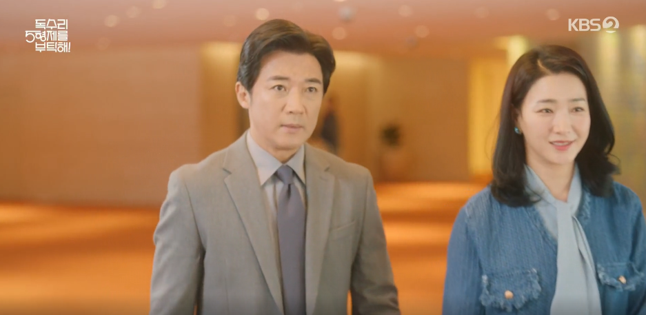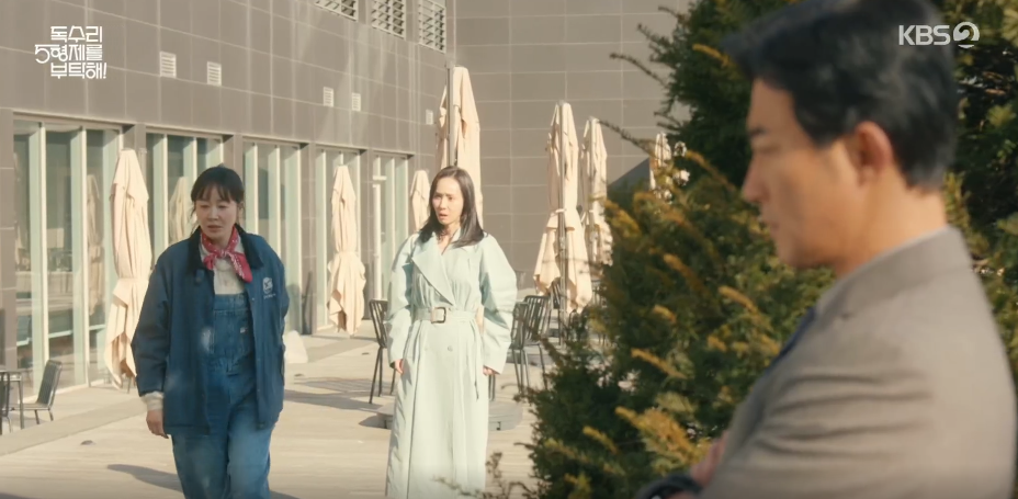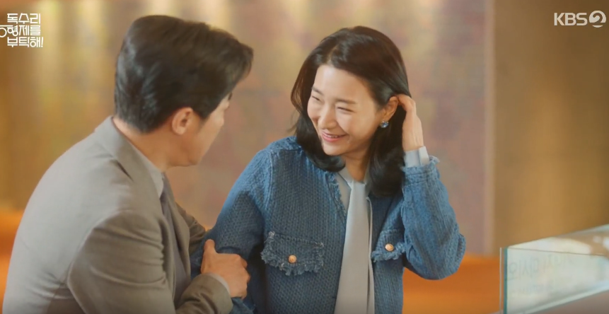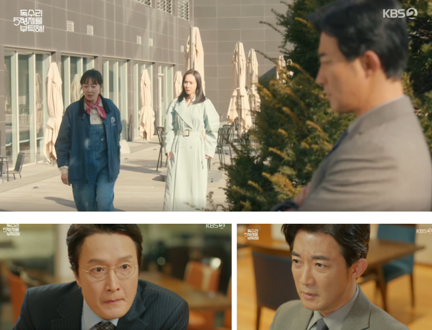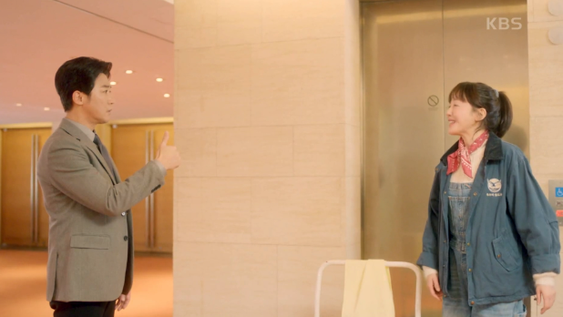 김교수는 전시를 위해 한회장이 샀던 그림을 대여해달라고 부탁을 하고, 답례로 밥을 산다고 하지만 부담스러운 동석은 차로 대신하자고 합니다. 이동하다가 김교수가 넘어지는 척 하고 동석이 이를 부축하는 모습을 본 광숙은 두사람 사이를 오해하고 잘어울린다는 뜻으로 엄치척을 하고 갑니다.