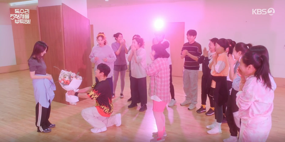 흥수는 수업이 끝날 무렵 회원들 앞에서 공개적으로 김원장에게 프로포즈를 하고 김원장은 흥수의 볼에 입을 맞추며 수락을 합니다.