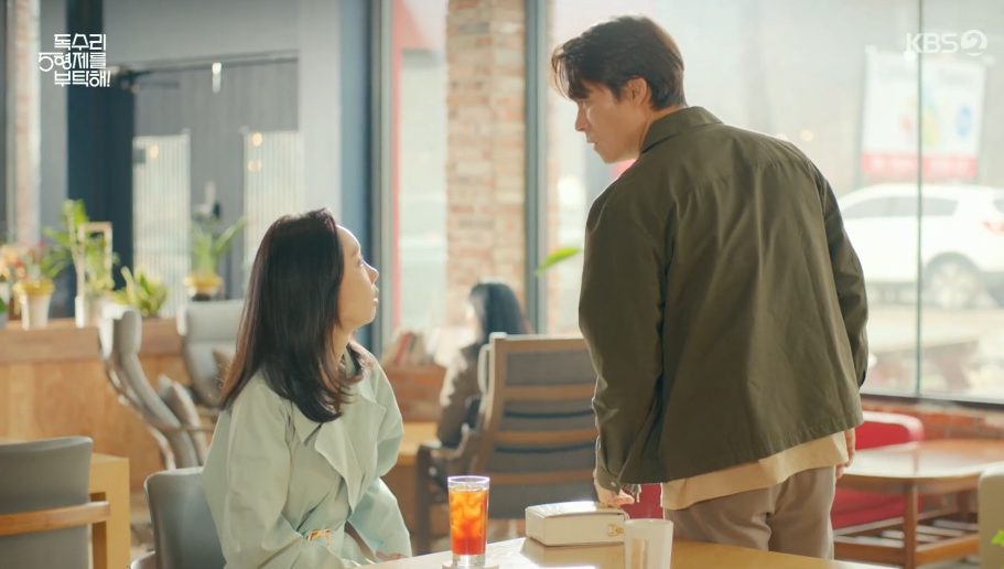 광숙의 행동에 기가막힌 동석은 김교수를 커피숍으로 먼저 들여보내고는 광숙을 찾아가 엄지척이 무슨의미냐며 따집니다.