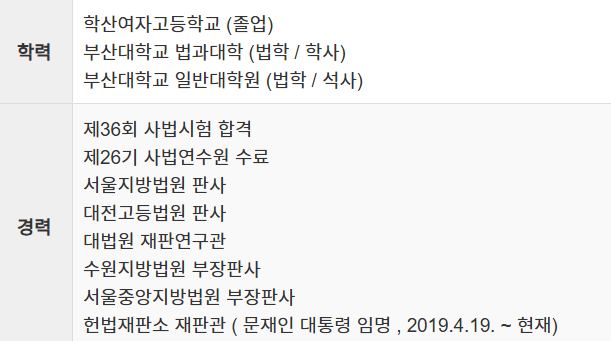 - “여성이고 지방대 출신인 저는 사회적 소수자와 약자를 대변하라는 임무를 부여받았다고 생각합니다. 헌법재판관이 되면 이 소명에 최선을 다하겠습니다.”