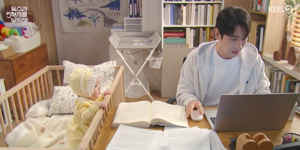 범수는 하니를 달래가며 집에서 일을 하고 있습니다.