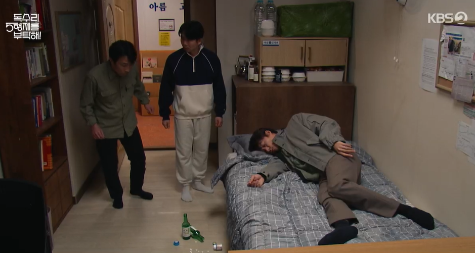 고시원에서 몇일째 전화벨만 울리고 천수가 기척이 없자 사람들이 강제로 천수의 방에 들어갔다가 쓰러져 있는 천수를 발견합니다.