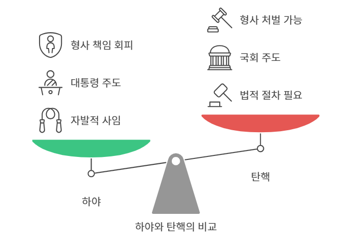 - 하야: 형사 책임 회피 가능성 존재, 공직 제한 없음.