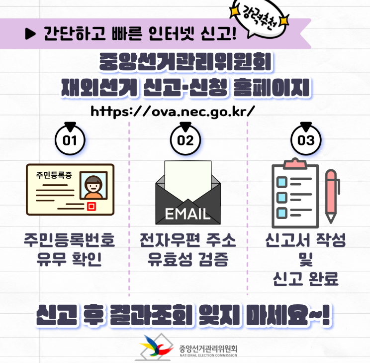 - 온라인 신청 활용: 대사관 방문이 어려운 경우, 중앙선거관리위원회 홈페이지에서 간편하게 신청할 수 있습니다.