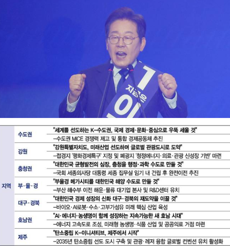 이재명 후보는 각 지역의 경제적·사회적 특성을 반영한 공약을 제시하며 지역 균형발전과 국가 경제 활성화를 목표로 하고 있습니다. 아래는 충청권, 영남권, 호남권, 수도권별 공약을 분야별로 정리한 내용입니다.