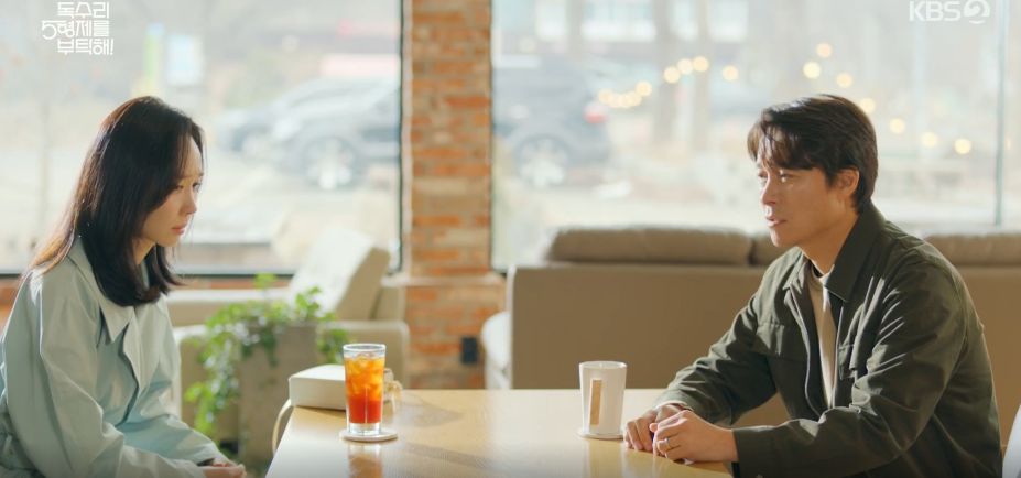 광숙의 행동에 기가막힌 동석은 김교수를 커피숍으로 먼저 들여보내고는 광숙을 찾아가 엄지척이 무슨의미냐며 따집니다.