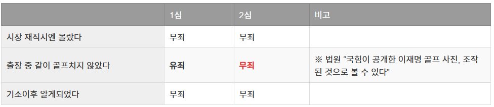 | 김문기 발언 | 골프 발언만 유죄 | 무죄 |